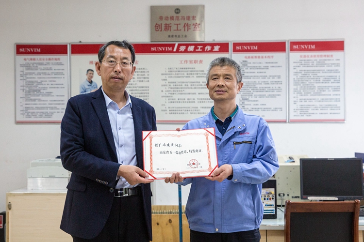 2021年5月19日,高密市總工會黨組書記、常務副主席宋進嶺來到孚日集團馮建宏工作室,將山東省總工會“齊魯工匠創新工作室”的牌匾授予馮建宏,并祝賀馮建宏本人榮獲“山東省五一勞動獎章”。